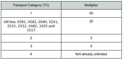For dangerous goods assigned different transport categories in column 15 of 3.2 Table A, the total quantity of each transport category is multiplied by a set quantity as given below. Excluding Category 4, the sum of the totals must not exceed 1000.