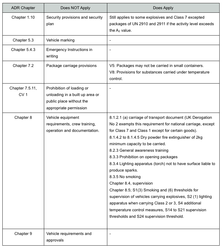 For example vehicle marking, equipment – (except for 2 kg fire extinguisher) and driver ADR training (but general awareness training still required).